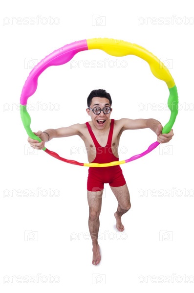 Смешной спортсмен с обручем на белом