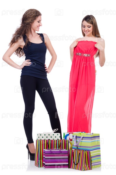 Женщины примеряют новую одежду на белом фоне