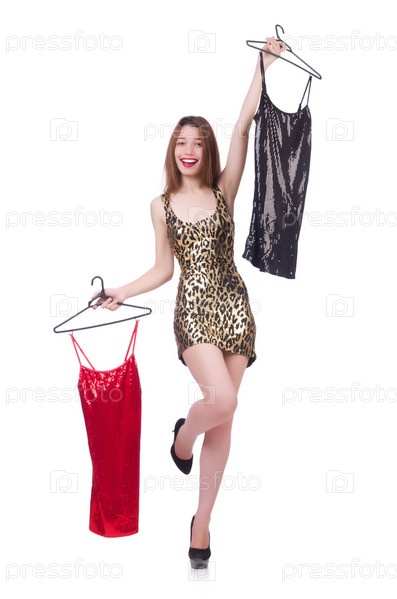 Женщина примеряет новую одежду на белом фоне