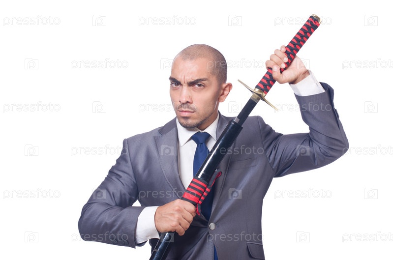 Бизнесмен с мечом, изолированный на белом