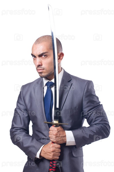 Бизнесмен с мечом, изолированный на белом