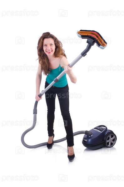 Молодая женщина с пылесосом на белом