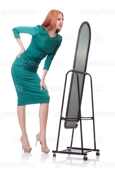 Женщина примеряет новую одежду на белом фоне