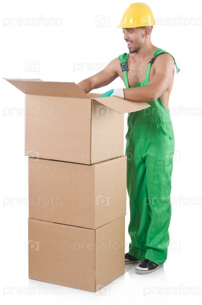 Мужчина в зеленом комбинезоне с коробкой