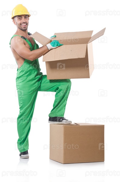 Мужчина в зеленом комбинезоне с коробками
