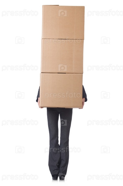 Деловая женщина с коробками на белом фоне