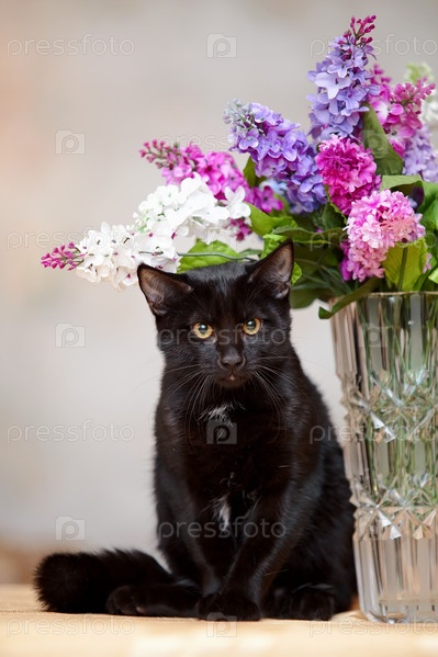 Злой черный кот сидит возле вазы с цветами
