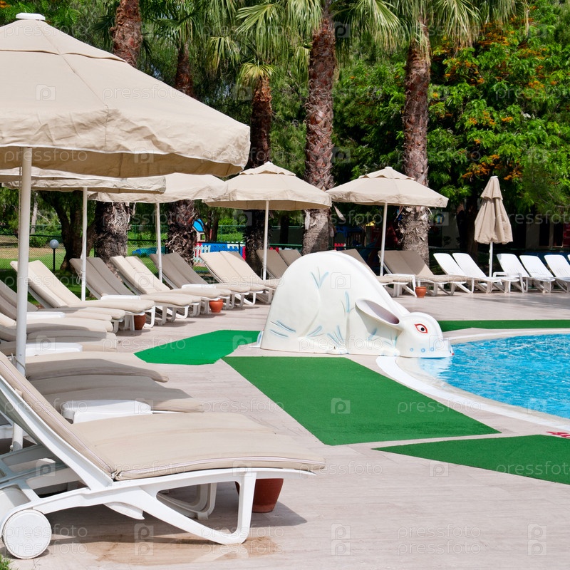 Открытый бассейн и красивые пальмовые деревья