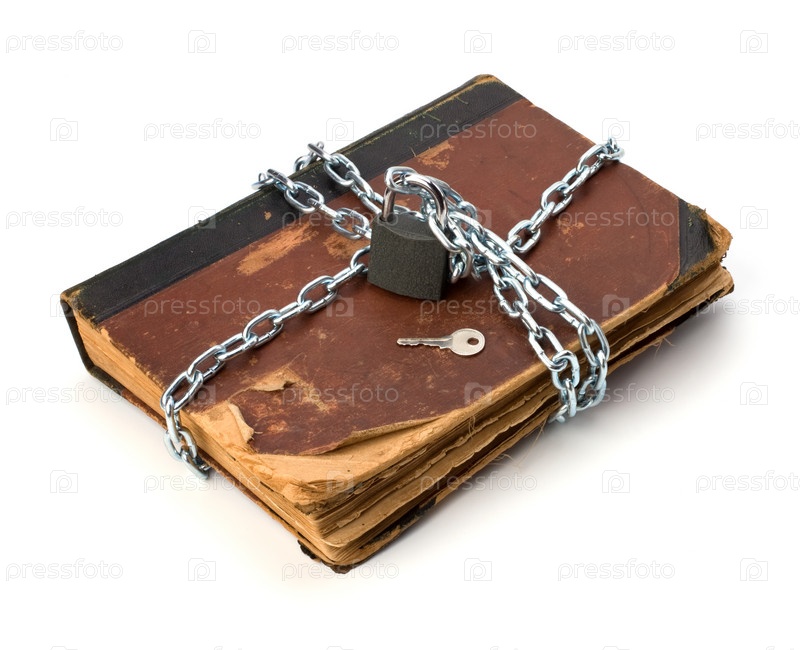 Потрепанная книга с цепью и замком, изолированная на белом фоне