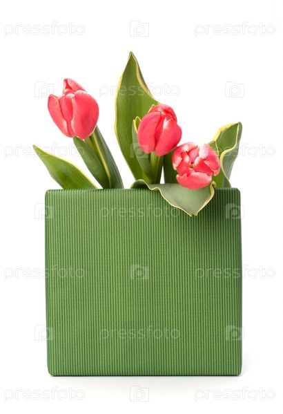 Подарок с розовыми тюльпанами, изолированные на белом фоне