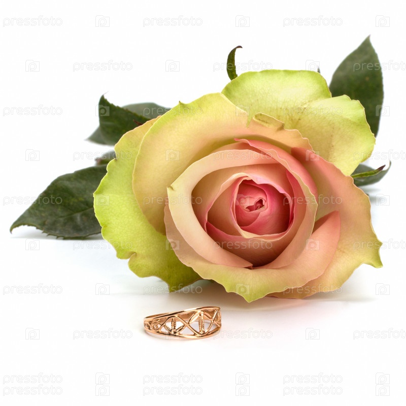 Красивая роза и обручальное кольцо, изолированные на белом фоне