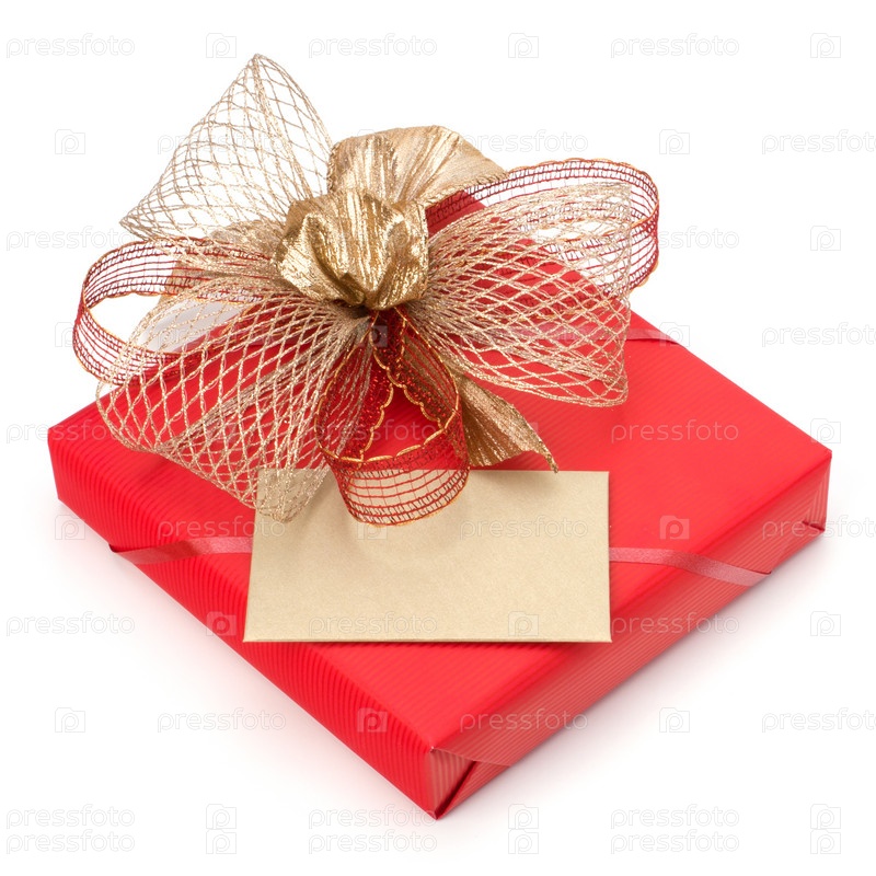 Подарок с поздравительной открыткой, изолированные на белом фоне