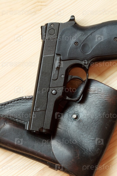 Современный автоматический пистолет и старый кожаный чехол на деревянного стола