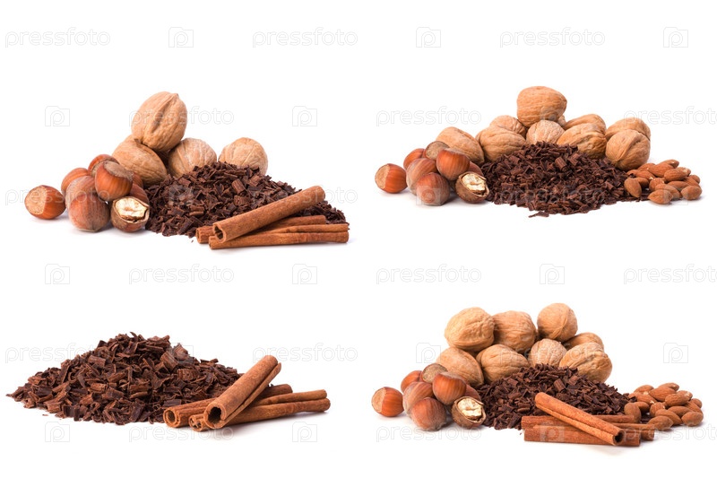 Тертый шоколад, орехи и корица, изолированные на белом фоне