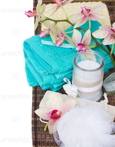 Набор для спа с голубым полотенцем, ароматическими свечами и банными принадлежностями