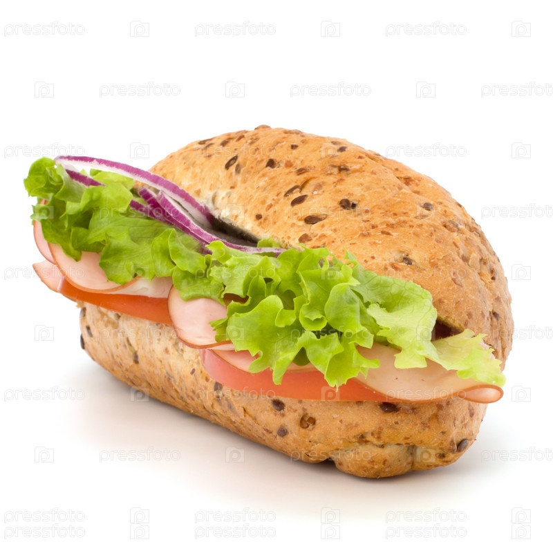 Фаст-фуд. Бутерброд с листьями салата, помидором, ветчиной и сыром в багете
