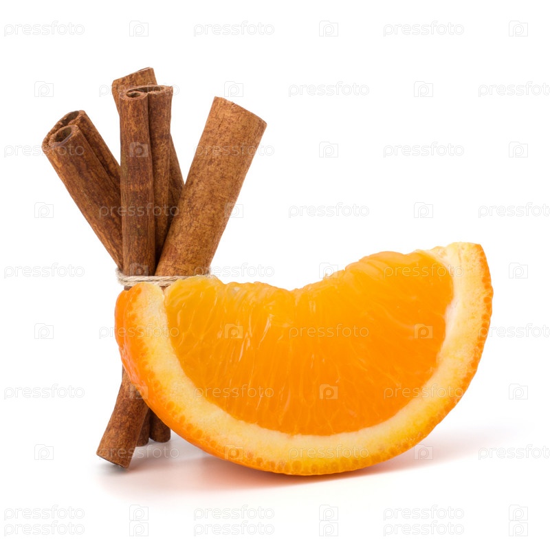 Долька апельсина и палочки корицы, изолированные на белом фоне