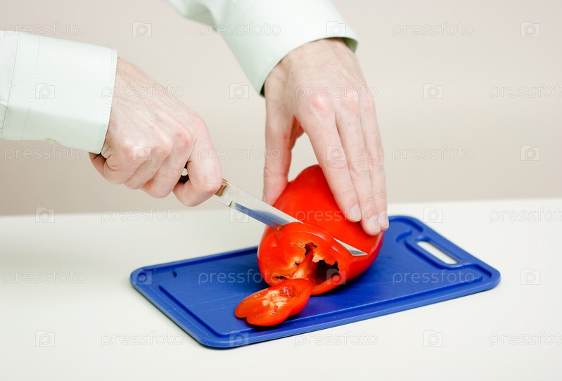Человек режет красный перец. Руки крупным планом