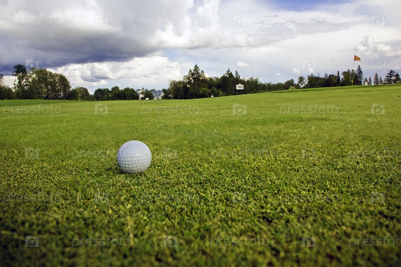 Мяч для гольфа на зеленой траве на фоне голубого неба и белых облаков