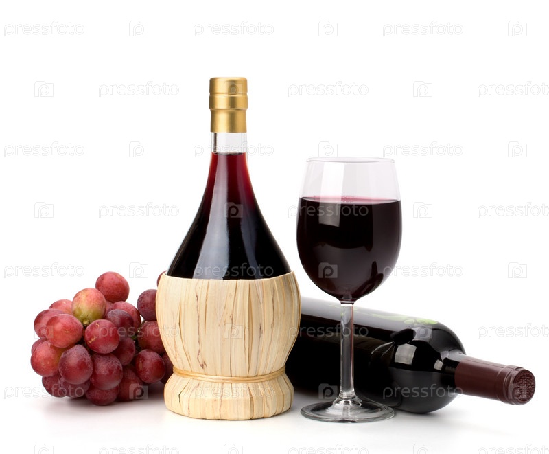Бокал красного вина, бутылка и виноград