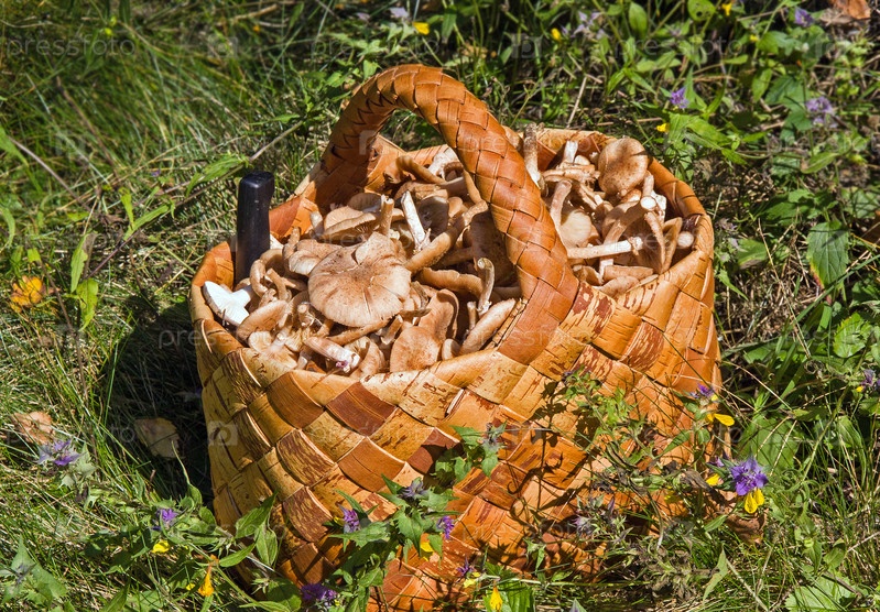 Берестяная корзина с грибами на траве в лесу