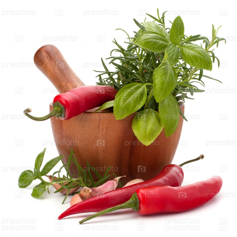 Свежие травы и специи в деревянной ступе