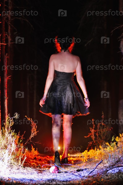Ведьма на Хеллоуин в темноте с яблоком