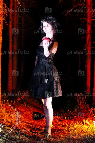 Ведьма на Хеллоуин в темноте с яблоком