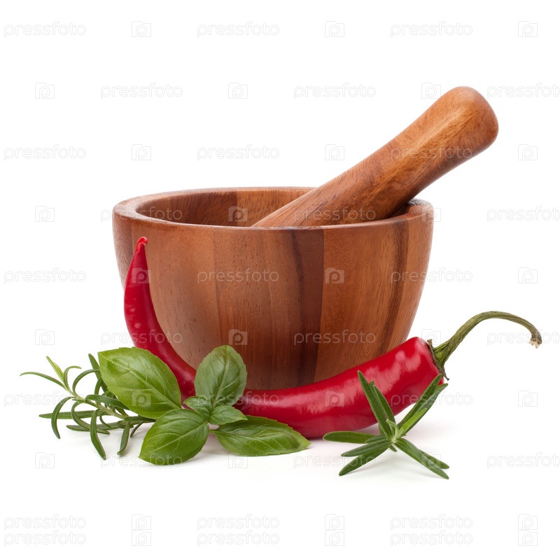 Свежие травы и специи в деревянной ступке