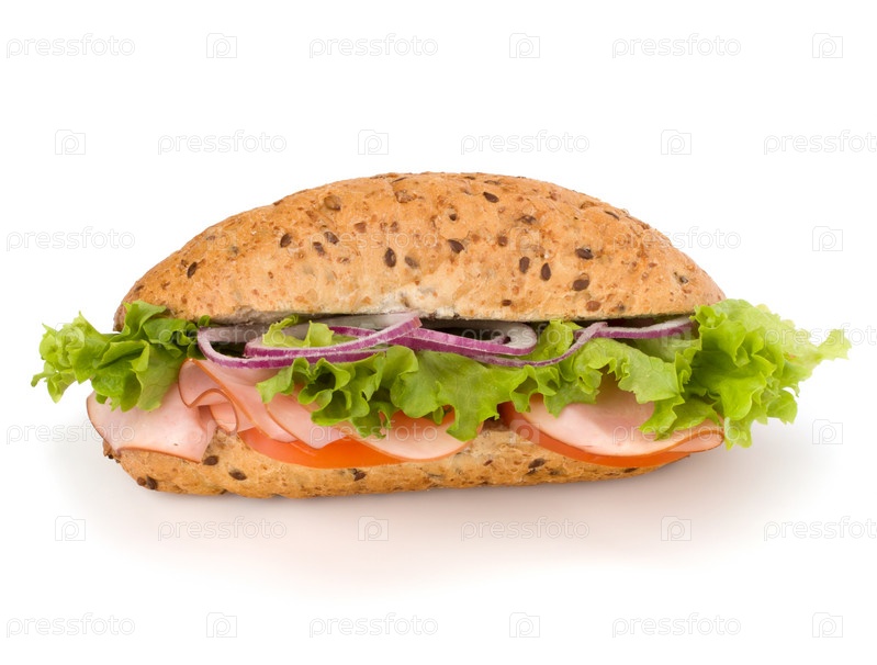 Бутерброд с листьями салата, помидором, ветчиной и сыром