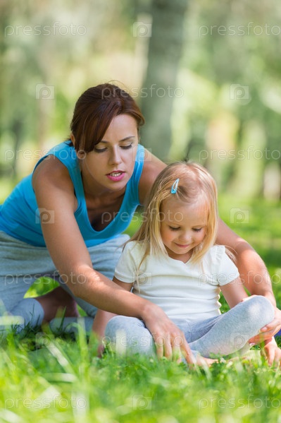 Мать и дочь делают упражнения на открытом воздухе