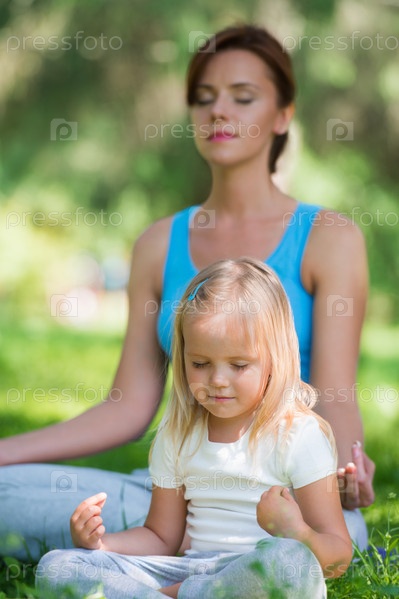 Мать и дочь делают упражнения на открытом воздухе