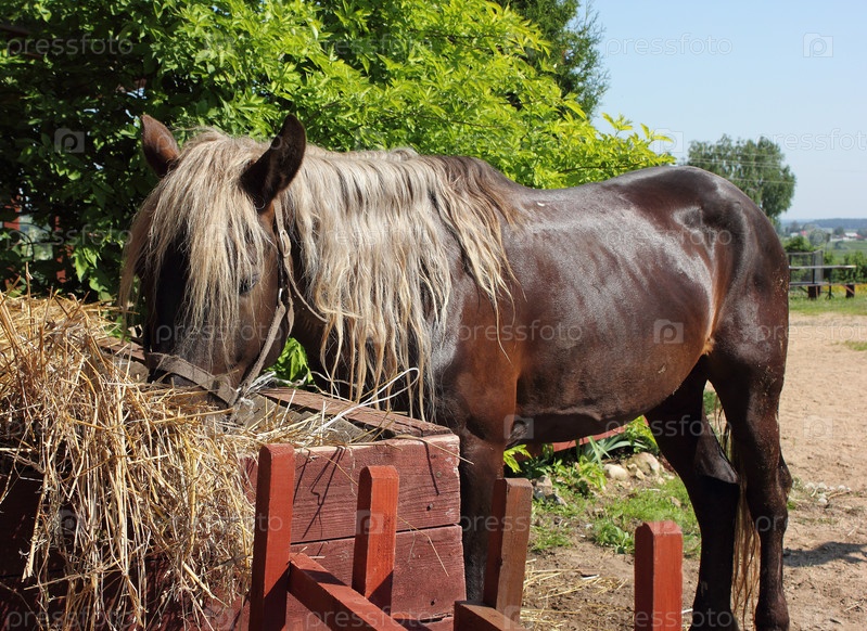 Лошадь ест сено из корыта в деревне
