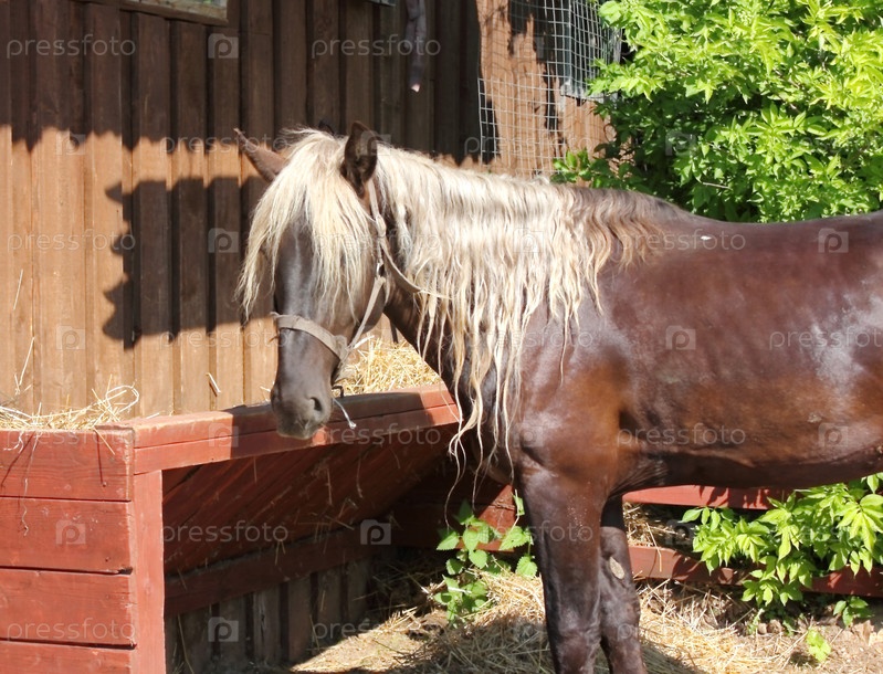 Лошадь ест сено в деревне
