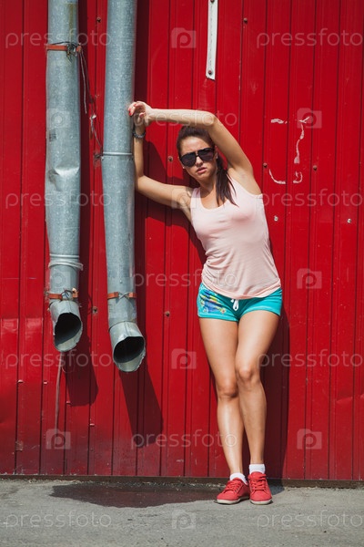 Девушка стоит у красной стены