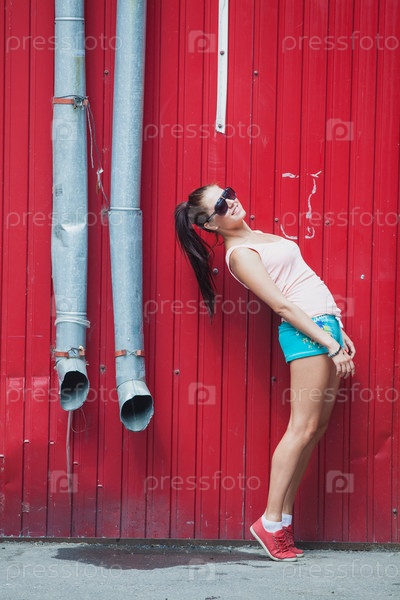 Девушка стоит у красной стены
