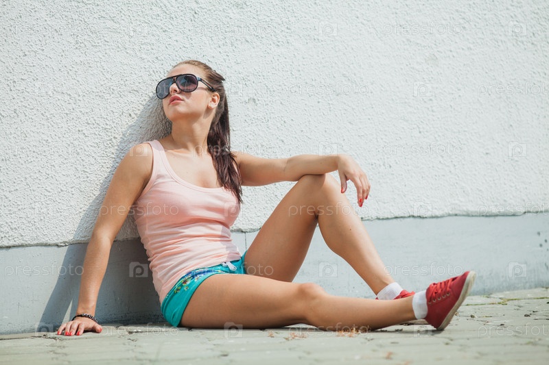 Симпатичная девушка сидит на улице города