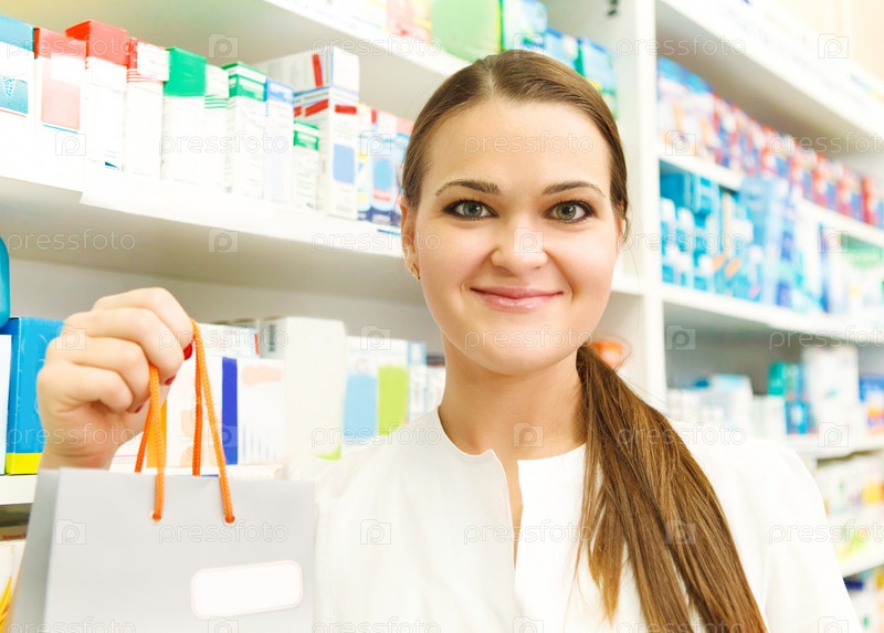 Улыбающаяся женщина-фармацевт с пакетом в аптеке