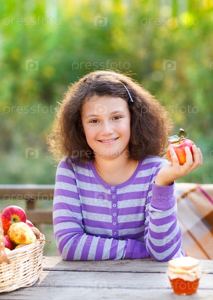 Маленькая улыбающаяся девочка с корзинкой красных яблок