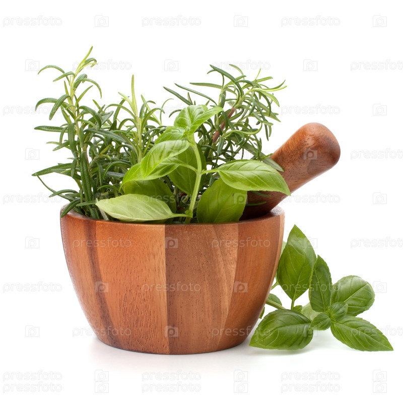 Свежие травы и специи в деревянной ступке