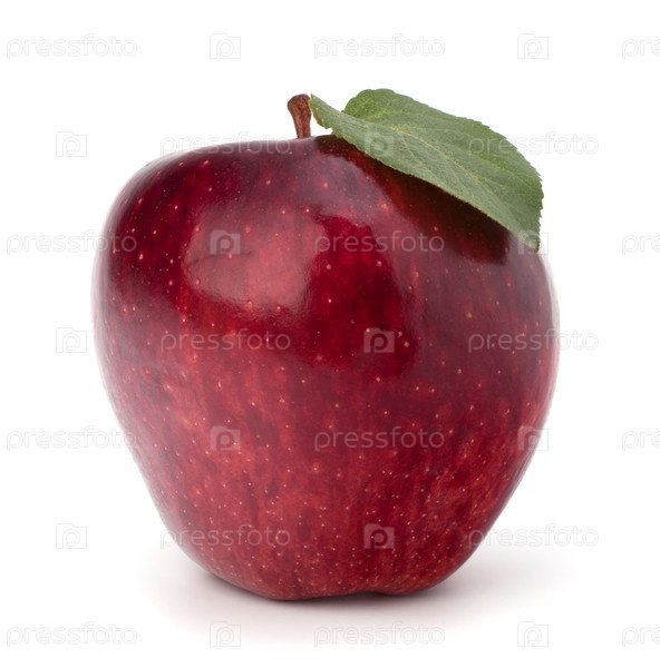 Сладкое красное яблоко с зелеными листьями