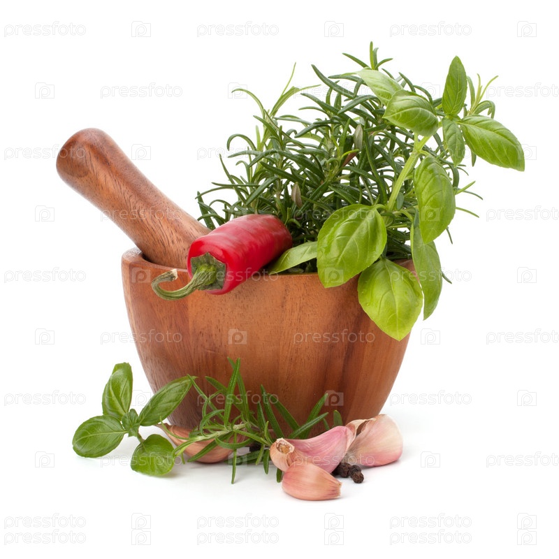 Свежие травы и специи в деревянной ступке