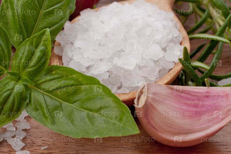 Свежие травы и соль в ложке