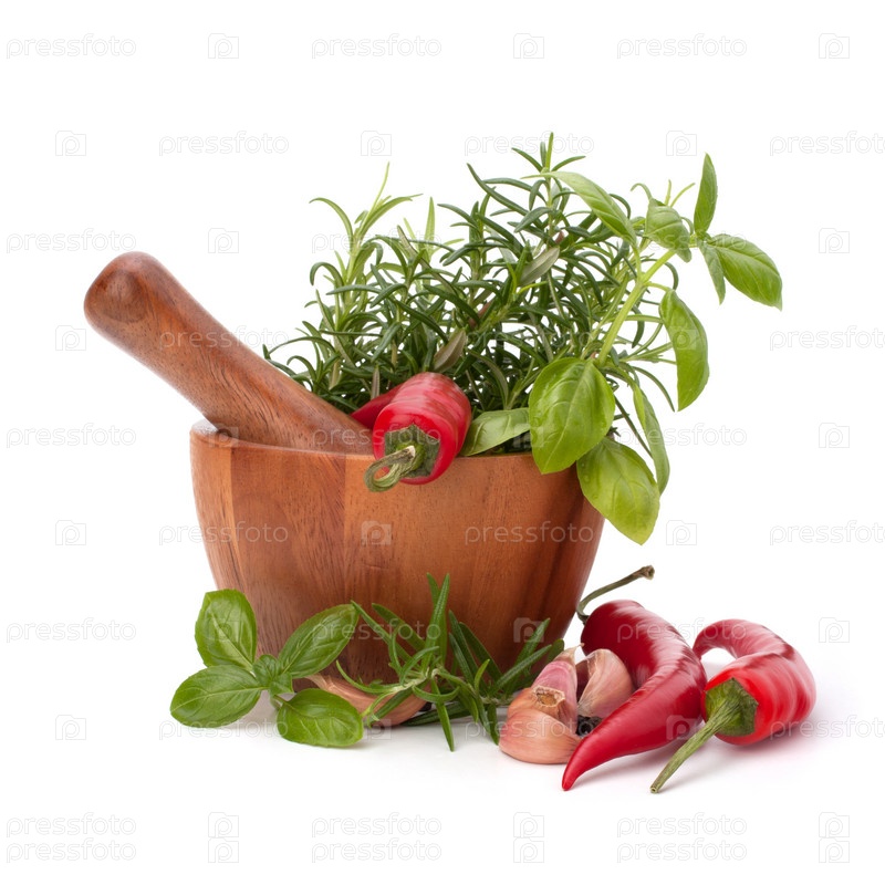 Свежие травы и специи в деревянной ступке