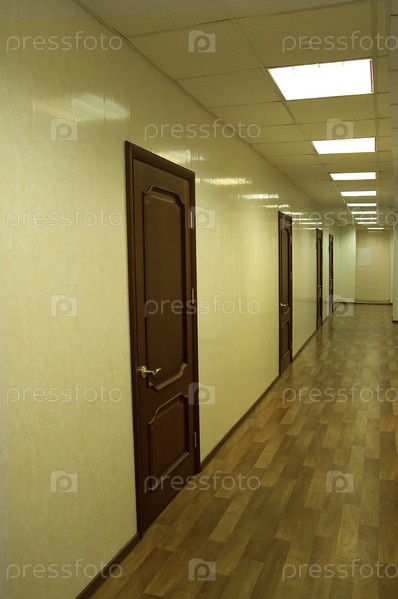 Ряд коричневых дверей в коридоре офиса на фоне бежевой стены, лампы на потолке