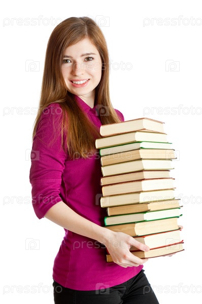 Улыбающаяся брюнетка со стопкой книг на белом фоне