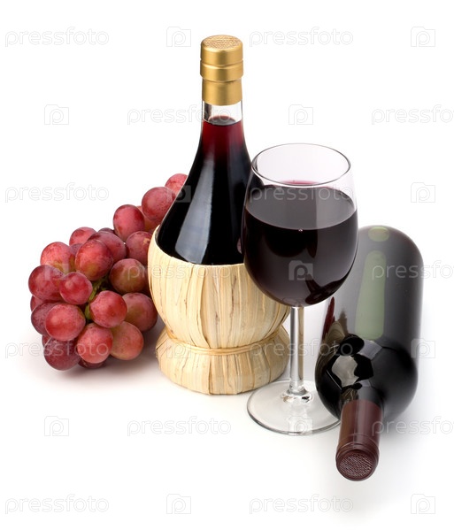 Бокал и бутылка красного вина и виноград