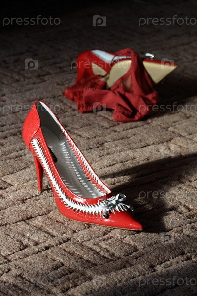 Пара красных туфель и нижнее белье на ковре