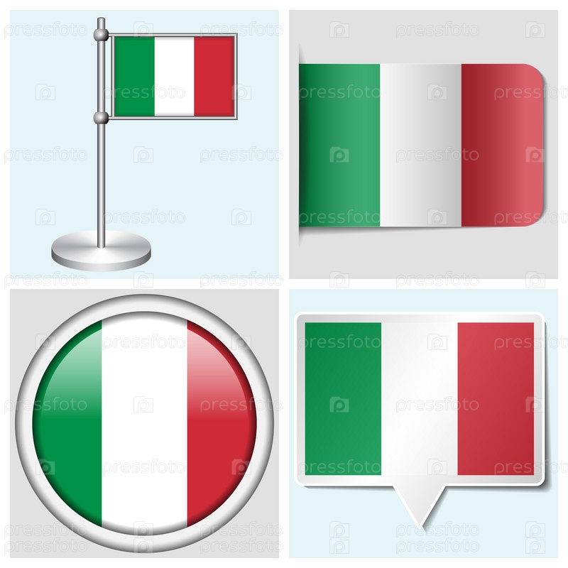 Итальянский флаг на стикерн, кнопкн, лейбле и флагштоке
