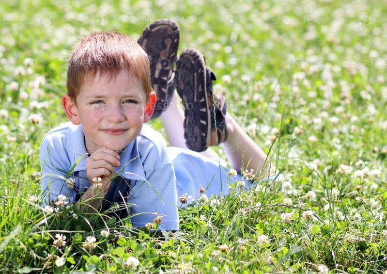 Маленький мальчик, лежащий в траве